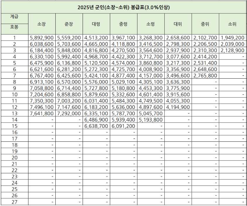 다음은 2025년도 군인 봉급표입니다. 2025년도에는 군인 월급이 2024 군인 봉급표에서 3% 인상되어 적용됩니다. 먼저 소장-소위급의 군인 봉급표와 이어서 부사관급의 군인 봉급표입니다.